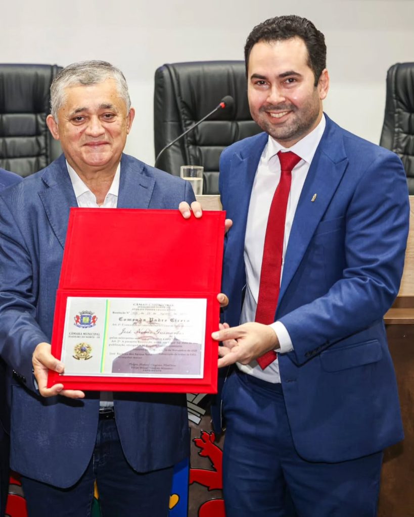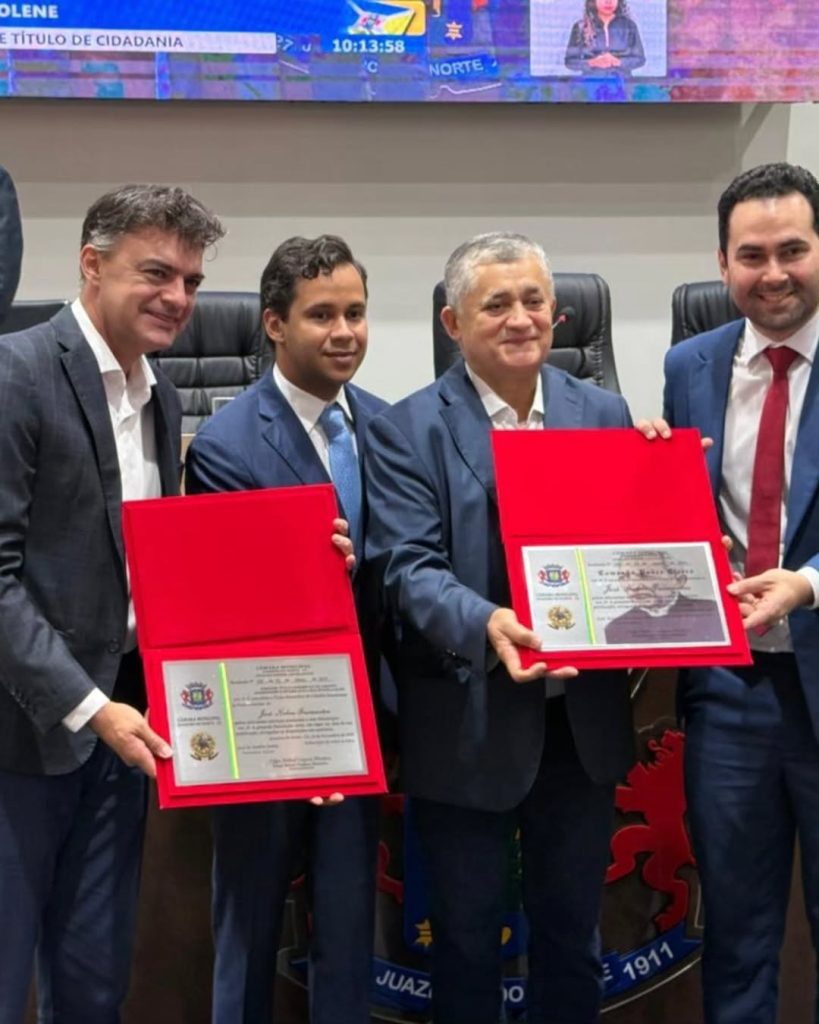 A Câmara Municipal de Juazeiro do Norte viveu um momento marcante na última sexta-feira, 14, durante a solenidade que homenageou o deputado federal e líder do Governo na Câmara, José Guimarães, com duas das honrarias mais importantes do município: a Comenda Padre Cícero e o Título de Cidadão Juazeirense. As distinções foram entregues pelo vereador Barbosa Neto, 1º secretário da Mesa Diretora da Câmara.