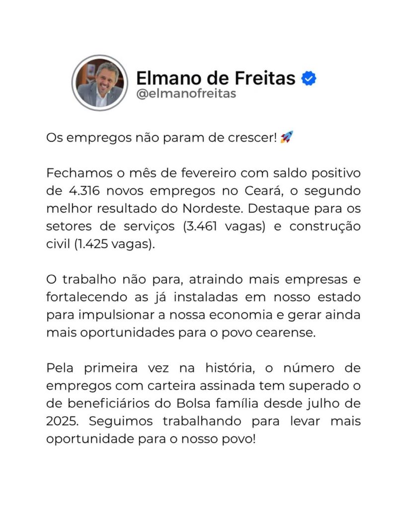 O governador Elmano de Freitas divulgou que o Ceará fechou o mês de fevereiro com saldo positivo de 4.316 novos empregos formais, alcançando o segundo melhor resultado do Nordeste. Os dados reforçam o ritmo de crescimento econômico do estado, com destaque para os setores de serviços, responsável por 3.461 vagas, e construção civil, com 1.425 novos postos de trabalho.